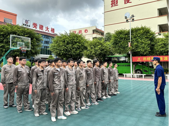 伴随着入企培训的开启,军训的号角就此吹响,3位消防队员担任教官,带领同学们开展了为期3天的军训。冬练三九,夏练三伏,有效的企业军训有利于打造军人般坚强的意志以及优秀的服从能力,同时也为彼此相识相知提供了媒介。同学们统一身着夏季劳保服,个个精神抖擞,人人斗志昂扬,立正、稍息、跨立、停止间转法、齐步行进与立定、跑步行进与立定等队列动作一气呵成,步伐整齐稳健、口令刚劲洪亮,引得在场观众赞不绝口。检验成果的最后还进行了体会分享,每位同学都上前进行了自我介绍,大部分同学还发表了自己的体会与感受,有对过往的感慨,也有对现在的坚持,更有对未来的展望。